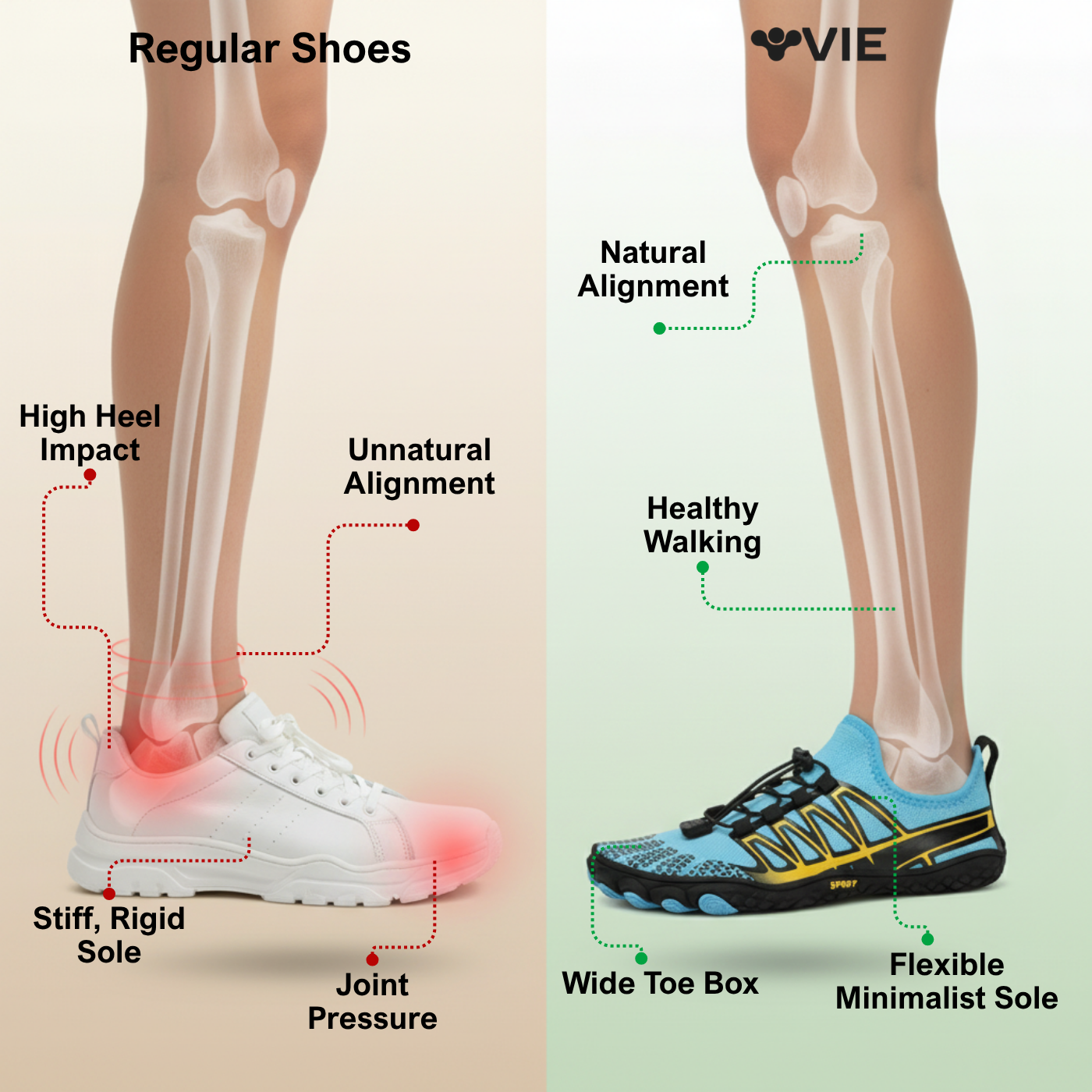 Stiff, rigid shoes force your body into unnatural positions — creating heel pain, knee pressure, lower-back discomfort and daily fatigue.