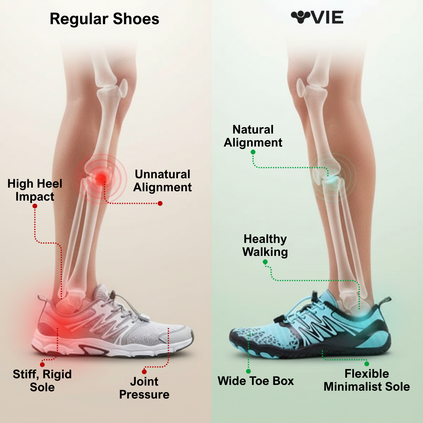 Stiff, rigid shoes force your body into unnatural positions — creating heel pain, knee pressure, lower-back discomfort and daily fatigue.